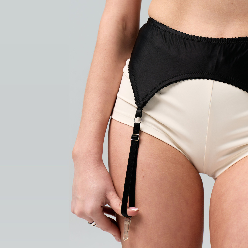 Пояс гартери виготовлений з гладкого еластичного біфлексу, який комфортно прилягає до тіла та не обмежує рухів. Матеріал поєднує міцність нейлону та еластичність спандексу, завдяки чому пояс добре тягнеться та зберігає форму під час танців і виступів. Мінімалістичний дизайн легко поєднується з різними танцювальними образами.
